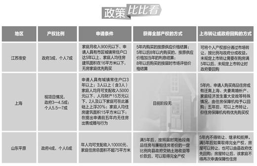 去年底,住房城乡建设部负责人表示:“鼓励地方从本地实际出发,积极创新住房供应模式,探索发展共有产权住房。”2月7日,本版报道了江苏淮安共有产权房政策的实施情况。上海市和山东平原县也推行共有产权的保障房多年。三地的具体措施有什么异同?