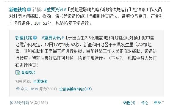 记者从乌鲁木齐铁路局官方微博获悉,经铁路工作人员对封闭区间线路、桥涵、信号等设备设施进行细致检查确认,各项设备良好,符合列车运行条件,18时52分,线路恢复正常运行。