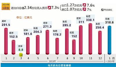 按美元计价,1月份,我国进出口总值3824亿美元,增长10.3%。其中,出口2071.3亿美元,增长10.6%;进口1752.7亿美元,增长10%;贸易顺差318.6亿美元,扩大14%。