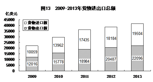 进出口稳中有升。全年货物进出口总额258267亿元人民币,以美元计价为41600亿美元,比上年增长7.6%。其中,出口137170亿元人民币,以美元计价为22096亿美元,增长7.9%;进口121097亿元人民币,以美元计价为19504亿美元,增长7.3%。进出口差额(出口减进口)16072亿元人民币,比上年增加1514亿元人民币,以美元计价为2592亿美元,增加289亿美元。