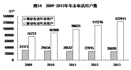 全年完成邮电业务总量[19]16679亿元,比上年增长11.1%。其中,邮政业务总量2725亿元,增长33.8%;电信业务总量13954亿元,增长7.5%。邮政业全年完成邮政函件业务63.20亿件,包裹业务0.69亿件,快递业务量91.9亿件;快递业务收入1442亿元。电信业全年局用交换机容量减少2697万门,总容量41052万门;新增移动电话交换机容量[20]12522万户,达到196545万户。年末固定电话用户26699万户。新增移动电话用户11696万户,年末达到122911万户,其中3G移动电话用户[21]40161万户。电话普及率达到110.5部/百人。互联网上网人数6.18亿人,其中手机上网人数[22]5.0亿人。互联网普及率达到45.8%。
