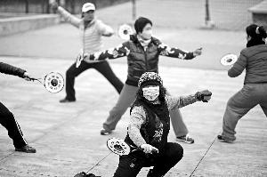 大爷大妈们没有被雾霾吓倒,他们戴上口罩坚持健身。晨报记者 王巍/摄