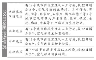 昨天,环保部有关负责人向媒体通报23日空气污染情况。卫星遥感监测表明,23日我国中东部地区空气污染影响面积约为98万平方公里,其中空气污染较重面积约为80万平方公里,主要集中在北京、河北、山西、山东、河南、辽宁等地。