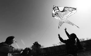 昨日,在故宫角楼下,两名青年放飞风筝。当天,持续一周的雾霾散去,北京迎来久违的蓝天。首席摄影记者 蔡代征/摄