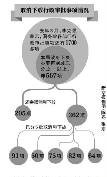 在国务院的带动下,去年3月至今分5批,取消和下放了362项行政审批项目。