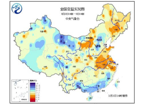 中新网3月3日电 据中央气象台预报,预计6日之前,冷空气将持续影响中国中东部地区。从西北地区东部、内蒙古中东部、华北、东北、黄淮至江淮、江南东部一带,将陆续出现4~6℃降温,局地降温幅度可达8℃。