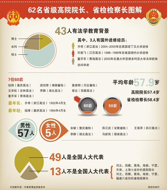 62名省级两高“掌门人”中,在就任现任职务前,有33人有检察院或法院工作经历。