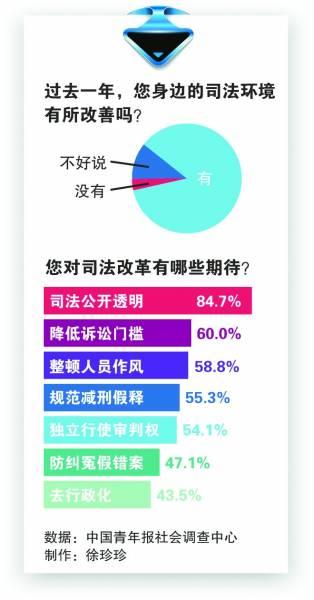 代表们对司法改革有哪些期待?调查显示,84.7%的受访代表期盼司法公开透明,60.0%的受访代表希望司法改革降低老百姓诉讼门槛,58.8%的受访代表认为应该整顿司法人员作风,55.3%的受访代表建议严格规范减刑、假释和保外就医程序,54.1%的受访代表希望确保审判权依法独立行使,47.1%的受访代表建议建立防止和纠正冤假错案机制,43.5%的受访代表建议司法机构去行政化。