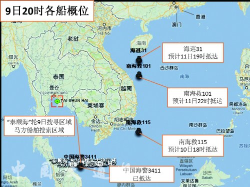 9日9时,正在失联海域附近航行的中远集团“泰顺海”轮按照中国海上搜救中心的指令,抵达北纬06度56分、东经103度35分海域展开搜寻。13时30分,“泰顺海”轮船长孟昭东通过海事卫星电话报告,当地海域天气状况良好,能见度较高,有利于搜寻。当日,经过9个多小时的连续搜寻,“泰顺海”轮未发现可疑物标。