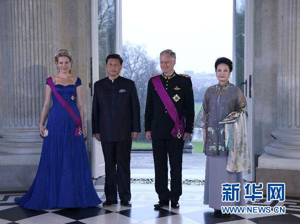3月31日晚,比利时国王菲利普在布鲁塞尔拉肯宫举行隆重国宴欢迎国家主席习近平到访。习近平和夫人彭丽媛抵达时,受到菲利普国王和玛蒂尔德王后热情迎接。 新华社记者 庞兴雷 摄