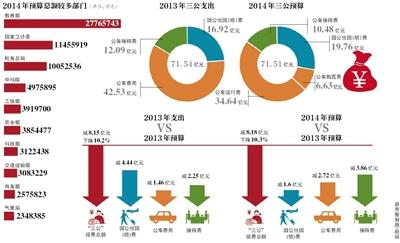 记者还发现,财政部公开的部门预算中,与往年单设一段文字介绍“三公”经费情况不同,今年新增了一张《“三公”经费财政拨款预算表》。据悉,这也是今年中央各部门预算公开的一大亮点,通过将2014年“三公”经费财政拨款预算数与2013年预算数、2013年预算执行数分别列示,方便社会公众进行对比,更好地实施舆论监督。 据新华社电