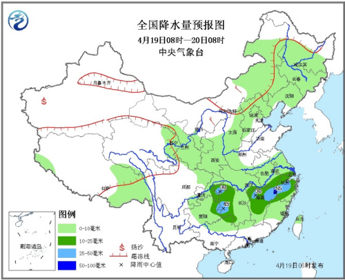 19日08时至20日08时,西藏东部、西北地区东部、青海东北部、内蒙古中东部、华北地区、黄淮西部、江汉、江淮、江南、西南地区东部等地有小雨,其中、重庆东南部、江南大部等地的部分地区有中到大雨,局地暴雨(50~55毫米),上述部分地区将有冰雹或雷暴大风等强对流天气。南疆盆地南部的部分地区有扬沙或浮尘天气。
