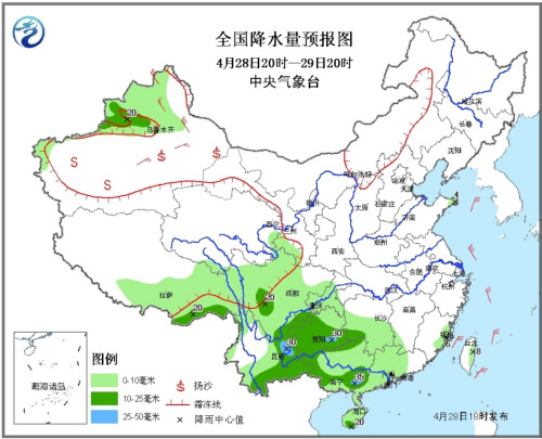 28日20时至29日20时,新疆西北部及沿天山地区、青藏高原中东部、西南地区大部、江南西南部、华南中西部等地有小到中雨,其中,云南东部、贵州东南部、广西东南部、海南南部等地的部分地区有大雨。上述部分地区并伴有雷暴大风等强对流天气。新疆北部和东部有5~7级风,其中,山口地区风力可达8~10级;南疆盆地、内蒙古西部等地有扬沙或浮尘天气,局部有沙尘暴。黄海、东海有7~8级大风、阵风9级。