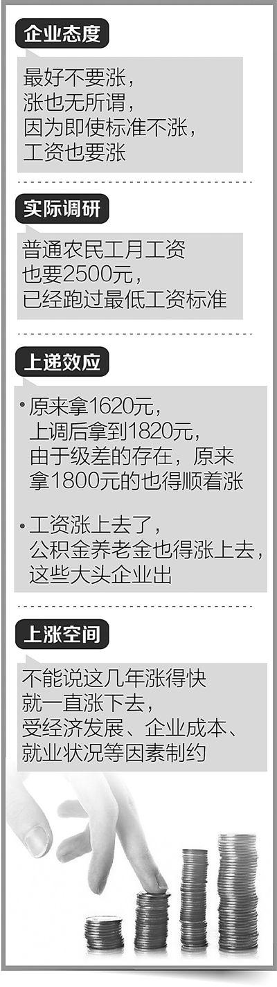 调研实际市场后,主管部门发现,原来企业都是把最低工资作为招聘工资在招人,这三五年来已经逐步不行了。上海现在招工,一个普通农民工一般也要2500元以上才行,已经跑过最低工资标准了。