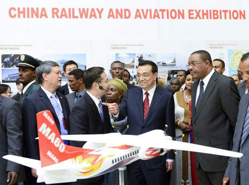 中新网亚的斯亚贝巴5月5日电 (记者 郭金超)当地时间5日上午,中国铁路航空展在非盟会议中心举行,中国国务院总理李克强及夫人程虹、埃塞俄比亚总理海尔马里亚姆夫妇、非盟主席祖马等共同参观。CRH380高速动车组、ARJ21客机等装备模型吸引着非洲政要的目光,他们不时询问高铁时速、飞机载客量等。李克强说,这些装备是中国自主研发,适合非洲国家需求,中国愿同非洲国家分享技术、培训、管理经验,帮助非洲实现世纪梦想。