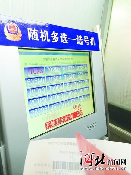 5月12日是周一,邢台市车管所又迎来一个上牌高峰,车主陈先生面对着大屏幕上两分钟一刷新的号段有些蒙。11日才开回家的新车,刚进车管所就听说来了一批新号,陈先生高兴之余有些挑花了眼。他站在自助选号机前输入了自编的几个号牌,显示已被占用,又来到随机选号机前,“这要是拍下去选不上,就给默认了。”犹豫了一下,陈先生还是决定碰碰运气,扫了一下刚打印的受理业务标签,屏幕上开始滚动一排排的号段,陈先生一巴掌拍下去,号段停在一个随机的页面上,页面共有20个号牌,150秒倒计时同时开始,如果倒计时结束他还没决定,第一个号牌冀E710X3将成为他的默认车牌,不能更改。