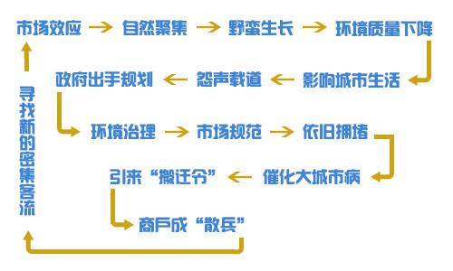 资本是逐利的,零售行业逐利的痕迹就在人口聚集点的移动中显现出来。这些市场在形成之初,无数“散兵游勇”式的商户在市场环境下自然选择了一些地段开始经营,初期基本属于“野蛮生长”的状态,直到规划政策出台,对市场进行规范化才具备一定的组织性,但他的低门槛和松散程度还是显而易见。