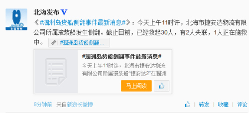 中新网5月16日电 据北海市人民政府新闻办公室官方微博“北海发布”消息,今天上午11时许,北海市捷安达物流有限公司所属滚装船“捷安达2”在涠洲岛西南角码头港池卸车上岸过程中,发生侧翻事故。截止目前,侧翻货船原有33人,已经救起30人,有2人失联,1人正在施救中。脱险30人中有2人伤势较重,已送往市人民医院救治。