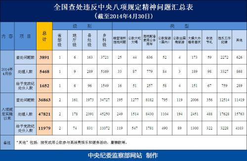 中新网5月26日电 据中央纪委监察部网站消息,为掌握全国贯彻落实中央八项规定精神情况,中央纪委在31个省(区、市)和新疆生产建设兵团、59个中央和国家机关建立了落实中央八项规定精神情况月报制度。截至2014年4月30日,全国查处违反中央八项规定精神问题情况如下: