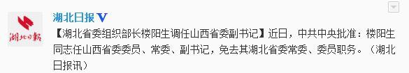 湖北省委组织部长楼阳生调任山西省委副书记