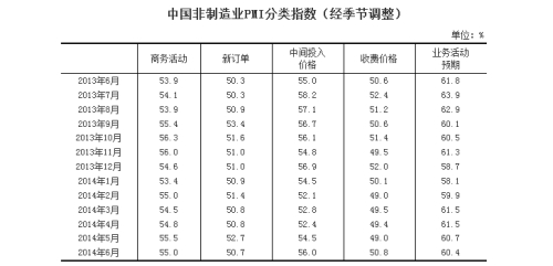 中新网7月3日电 据国家统计局网站消息,2014年6月,中国非制造业商务活动指数为55.0%,虽比上月回落0.5个百分点,但仍高于荣枯线5.0个百分点。