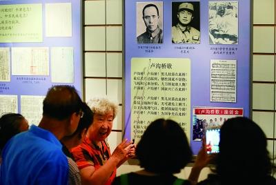 何基沣之女何玟女士来到抗战史料展厅,向大家讲解她父亲当年守桥事迹,这首《卢沟桥歌》就是根据守桥命令编的 摄/法制晚报记者 林晖