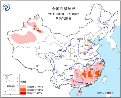 中新网7月11日电 据中央气象台网站消息,起源于四川盆地的强降雨天气今日将向东扩展,预计未来24小时,江汉、江淮大部都将出现大到暴雨天气,其中四川东北部、湖北东北部的局部地区还将有大暴雨。另外,今天白天南方大部的高温天气仍将持续,湖南东南部、江西西南部、福建大部都将出现37℃以上的高温天气。
