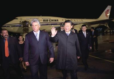 21日晚,习近平乘坐的专机抵达哈瓦那何塞·马蒂国际机场。古巴国务委员会第一副主席兼部长会议第一副主席迪亚斯·卡内尔热情迎接。