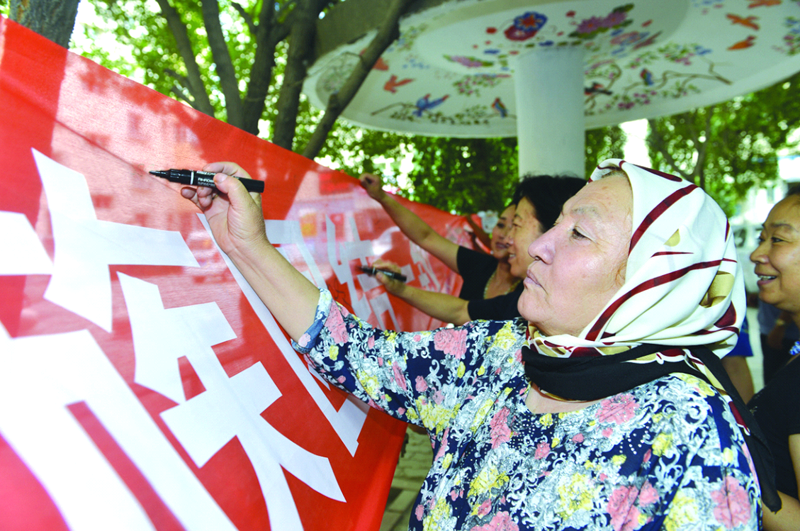 在和田街街道交通社区,居民在“各民族团结一致,捍卫美丽家园”的横幅上签名。新疆都市报(记者苏璐萍 秦鹏 实习生李孟非报道)