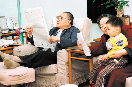 邓小平阅读报纸。一旁,卓琳在为孙子讲故事。