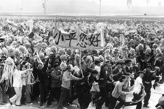当参加国庆游行的大学生通过天安门时,队伍中突然展开了“小平您好”的横幅,这一表达亿万人民心声的标语,永远被历史定格。在举世瞩目之中,国人记住了那激动人心的一幕。那情之所至,没有程式,稚拙而真诚的字体也留在国人的记忆里。