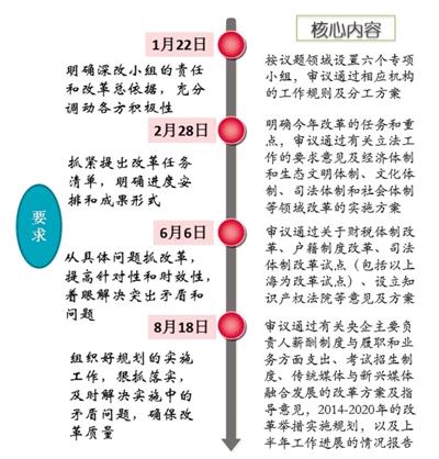 10个月的时间,中央深改小组从设立到召开四次会议,从制度设计到推出整体改革纲要,在“紧锣密鼓”的同时,改革同样“蹄疾步稳”。