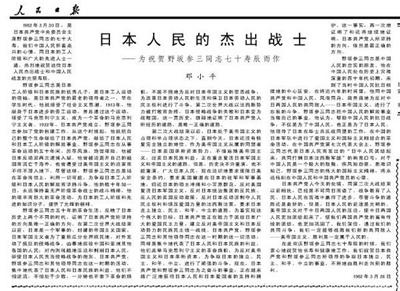 1962年,邓小平在《人民日报》发表了一篇《日本人民的杰出战士——为祝贺野坂参三同志七十寿辰而作》,以祝贺日本共产党中央委员会主席野坂参三的七十大寿,并借此表达了对中日关系的期待。他写道:“战争教育了人民。日本人民在苦难中赢得了进步。尽管斗争的道路还是曲折的,但是,日本人民的前途是光明的。美帝国主义对于中日两国人民的压迫,使中日两国人民更加团结起来了,使我们两国共产党的富有传统的团结,也更加巩固了。”