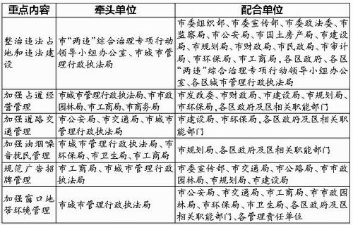 根据市政府“78号文件”要求,我市将力争用3年时间,大力查处违法占地和违法建设(简称“两违)、占道经营、占道停车、违章设置户外广告、建筑渣土撒漏乱倒等城市综合管理12个方面的顽疾,提升城市运行秩序和市容市貌。为此,市城管办、市执法局牵头开展了针对这12项城市管理顽疾的综合整治行动,成效明显。