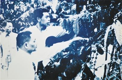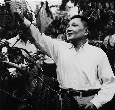1960年初,邓小平腿伤康复期间到海南岛视察工作,在兴隆华侨农场采摘咖啡豆,杨绍明拍摄了这张照片并取名《喜摘咖啡豆》。 (资料照片)