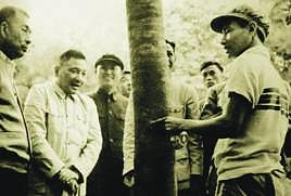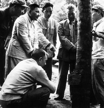 1960年,邓小平在万宁南林农场观看工人割胶。(资料照片)