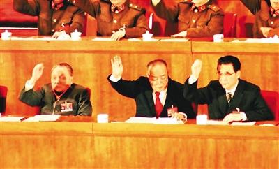 1988年4月13日上午9时35分,第七届全国人民代表大会第一次会议主席台上,邓小平等党和国家领导人庄重地举起右手,表决通过了关于设立海南省的决定和建立海南经济特区的决议。 戴苏春 摄