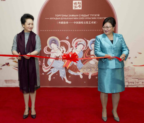 中新网乌兰巴托8月22日电(记者 欧阳开宇)习近平主席夫人彭丽媛和额勒贝格道尔吉总统夫人包勒尔玛22日上午共同出席为庆祝中蒙建交65周年暨“中蒙友好交流年”举行的中国文化周开幕式并剪彩,欣赏蒙古艺术家的精彩演出,并参观中国敦煌文化艺术展,观赏临摹的敦煌石窟壁画、复制泥塑和乐器。