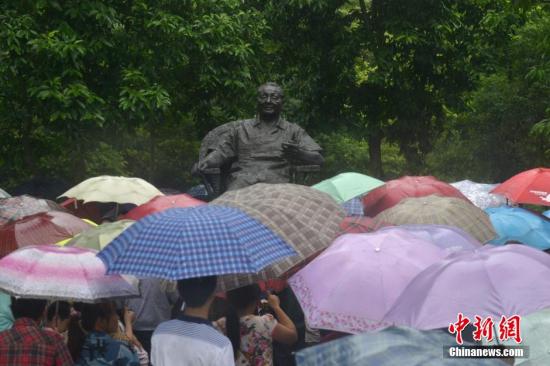 8月22日,邓小平诞辰110周年纪念日,各地民众冒雨前往四川广安邓小平铜像前鞠躬献花,缅怀世纪伟人。 张浪 摄