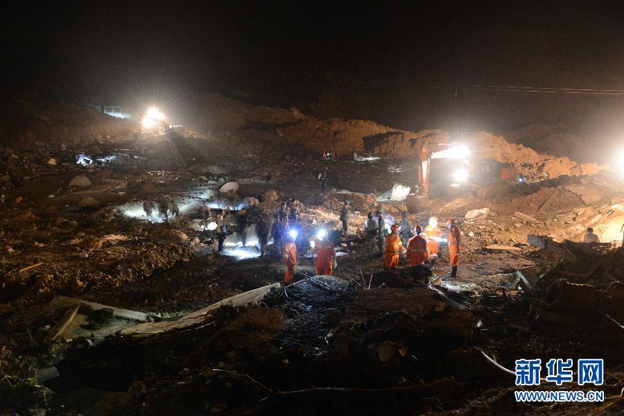 这次山体滑坡体量达100万立方左右。在事故现场记者看到,英坪村小坝组坐落在山脚下,有近一半的山体垮塌下来,把小坝组和新湾组的房屋掩埋冲垮。加之垮塌山体背后有一座水塘,垮塌山体激起水塘里的水对房屋也造成冲击。现在,大部分房屋已看不到屋顶。现场有三台挖掘机作业,消防、武警官兵和专业救援队伍在用搜救犬和生命探测仪进行救援并用器具进行挖掘。