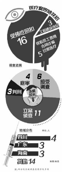 这24名医院院长中,已有16人进入司法程序,有3人已经判决,其他6人还在接受组织调查,或者已经立案调查。