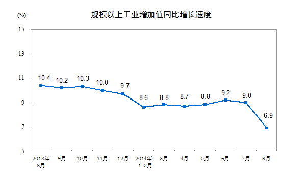 中新网9月13日电 据国家统计局网站消息,国家统计局今日公布的数据显示,2014年8月份,规模以上工业增加值同比实际增长6.9%(以下增加值增速均为扣除价格因素的实际增长率),比7月份回落2.1个百分点。从环比看,8月份比上月增长0.20%。1-8月份,规模以上工业增加值同比增长8.5%。