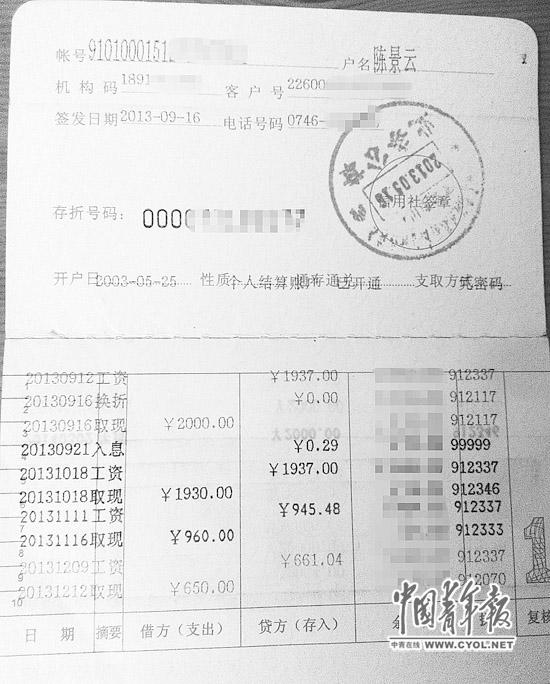 陈景云的一张存折。其中,在陈景云未上班的2013年9月、10月、11月期间,仍然收到了工资。 本报记者 卢义杰摄