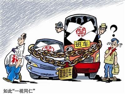 一些职工认为,企业取消职工交通车的做法属于“领导生病、百姓吃药”。他们说,按照上级规定取消领导“座驾”,这是为了防止公务用车中的腐败行为。然而一些企业领导以“我没有小车坐,你们也别想有大车坐”的思维取消了职工交通车,从表面上看是为了给企业节省开支,实际上是不把职工放在心上、政治上不成熟的表现。