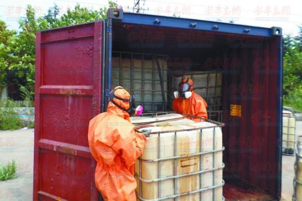黄岛检验检疫局检验人员查处的越南进口危化品泄漏。