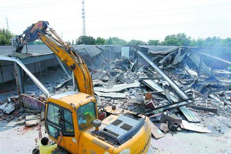 昨日,工程机械在拆除嘉定区江桥镇违章搭建的厂房。 本报记者 张海峰 摄
