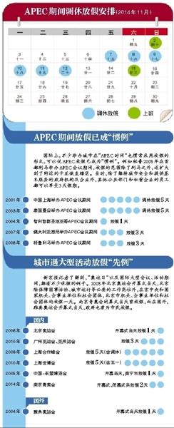 2014年亚太经济合作组织领导人非正式会议将于11月在北京召开。昨天,北京市人民政府发布“关于在2014年亚太经济合作组织会议期间调休放假的通告”。