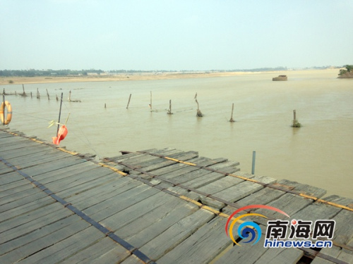 这两座木桥分别从马坡渡口、东苍渡口到定安县城,两桥相距不过百米。桥面两边支着一些铁杆,杆与杆之间拉了些绳就算护栏了,在为会车加宽的桥段部分,甚至连这些敷衍的护栏都没有。木桥上的木板有时铺得不太密,站在桥上,透过木板的缝隙,能看到桥下南渡江的滚滚江水——这还得是枯水期,若汛期来了,别想站在桥上了,站在岸边都看不见桥,涨潮的江水轻易就把桥淹没了。定海大桥代建单位驻施工现场的代理办副主任戚中洋从2013年起就到木桥的上游——新建的定海大桥工作。他说,我们来了后,新建的工程把水里的一些漂浮物挡住了,不然这两条木桥年年都要被冲毁。