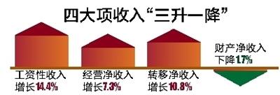 前三季度,海南居民四大项收入呈现出“三升一降”的态势。工资性收入、经营净收入和转移净收入分别增长14.4%、7.3%和10.8%,财产净收入下降1.7%。