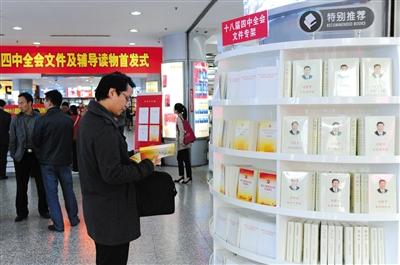 10月31日,一名读者在十八届四中全会文件专架前翻阅。这些文件和辅导读物首印总数为515万册。